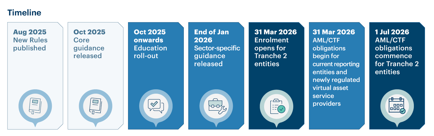 The timeline below outlines AUSTRAC’s planned rollout of the new AML/CTF framework, from the release of new rules and guidance through to full Tranche 2 commencement. These milestones are important for law firms planning their AML compliance activities and system readiness. Throughout this timeline, AUSTRAC will release guidance and supporting materials to help newly regulated entities prepare.